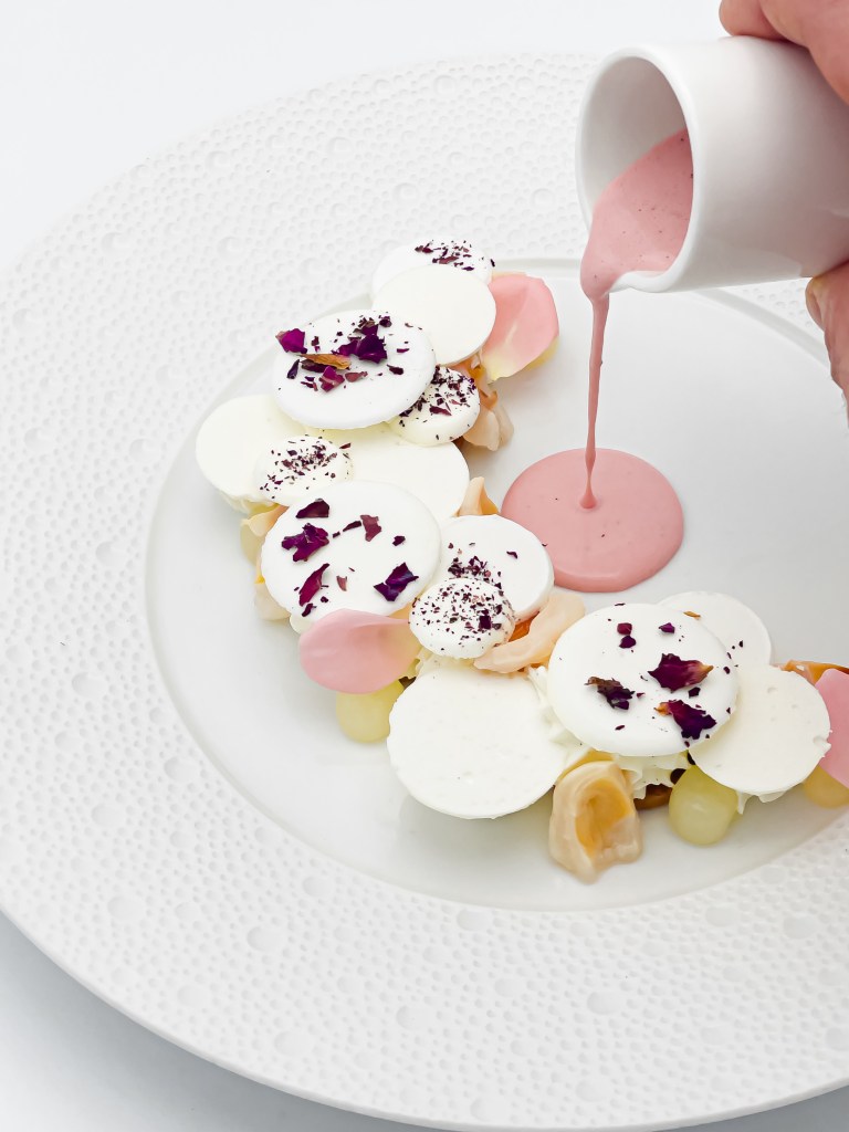 C’est une création que Pierre et moi avons dû réaliser au Fouquet’s pour une édition des “40 femmes Forbes”. On nous a demandé une association avec un parfum de Marly, Delina. Il a fallu créer un dessert qui reprenait toutes les notes du parfum : la rose, le litchi et la vanille. C’est le dessert qui nous a donné le plus de fil à retordre. Nous avons imaginé un gel litchi, un crémeux vanille, des meringues à la rose, une crème anglaise vanille rose et des segments de litchi frais.